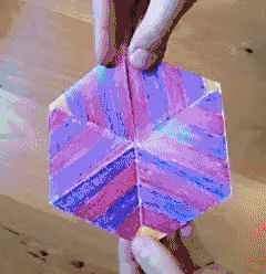 L'objet plat à la forme d'un hexagone. Selon l'épaisseur, il peut correspondre à un trihexaflexagone, un tetrahexaflexagone ou un hexahexaflexagone