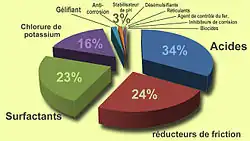 Proportions de divers agents chimiques utilisés dans la part d'additifs du fluide de fracturation (pour un cas présenté, dans le réservoir « Fayetteville Shale » aux États-Unis[29]