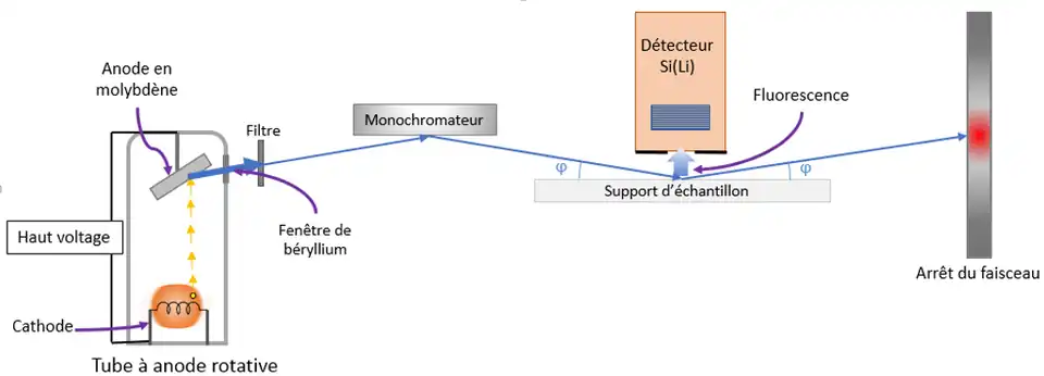 Une des sources à rayons X les plus utilisées est le tube à anode rotative qui consiste en un tube avec, à une extrémité, une cathode immobile et à l’autre extrémité, une anode qui tourne et qui est refroidie par l’eau. Sur la cathode, il y a un élément subissant une grande différence de potentiel dans un champ électromagnétique, ce qui détache et accélère ses électrons vers l’anode rotative. À l’impact, l’anode (généralement en molybdène) émet un rayon X qui est dirigé vers une sortie. L’anode est en rotation pour avoir le plus d’impact possible et est refroidie, car l’impact crée beaucoup de chaleur. Une fois le rayon X sorti du tube, un filtre avec des fentes très minces vient modeler le rayon en faisceau rectangulaire presque bidimensionnel, comme la forme d’un rectangle de papier pour avoir une meilleure maniabilité et une meilleure précision pour atteindre l’angle de réflexion totale en créant une divergence verticale plus petite que 0,01°[1].