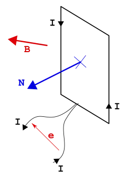 où est l'angle entre les lignes du champ d'induction et le vecteur normal au plan de la surface S. Ainsi, si la surface est perpendiculaire aux lignes du champ , cet angle est égal à 0 et si son cosinus vaut 1 le flux est maximum.
