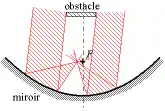 Par ailleurs, si un obstacle bouche partiellement l'ouverture de l'instrument d'optique, cela va diminuer l'intensité visualisée, mais n'altèrera pas l'image, puisqu'il suffit de prendre des rayons venant à côté de l'obstacle (n'oubliez pas que seule la direction des rayons compte). Ainsi, la présence d'un petit miroir devant l'ouverture du grand miroir dans les télescopes de Newton et de Cassegrain ne gêne pas la formation de l'image. La présence du capteur devant le miroir d'une parabole de télévision ne gêne pas la réception des ondes. Par contre, on arrête les rayons passant à proximité du centre optique, on s'éloigne donc des conditions de Gauss, l'image est donc légèrement plus floue.