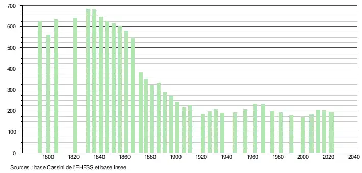 L'évolution du nombre d'habitants est connue à travers les recensements de la population effectués dans la commune depuis 1793. Pour les communes de moins de 10 000 habitants, une enquête de recensement portant sur toute la population est réalisée tous les cinq ans, les populations de référence des années intermédiaires étant quant à elles estimées par interpolation ou extrapolation[20]. Pour la commune, le premier recensement exhaustif entrant dans le cadre du nouveau dispositif a été réalisé en 2006[21].