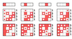 La non-linéarité des quatre fonctions booléennes à deux entrées avec poids de Hamming 1. Ce sont des fonctions courbes, ainsi que les quatre compléments avec poids de Hamming 3. Ce diagramme montre la distance de Hamming entre chacune de ces fonctions courbes (vecteurs du haut) et les quatre fonctions linéaires (matrices du milieu) et les quatre fonctions affines (matrices du bas). La différence entre les fonctions courbes et les fonctions linéaires et affines sont mises en valeur par des points. Une case rouge représente une valeur de 1, et une case blanche une valeur de 0.