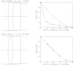 - La courbe inférieure correspond à l'évolution du contraste d'une fréquence spatiale plus élevée (souvent 30 cycles par millimètre) en fonction de la distance au centre de l'image.
