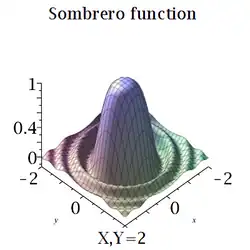 Une fonction sombrero (parfois appelée fonction besinc ou fonction jinc )[ 1] est l'analogue bidimensionnel en coordonnées polaires de la fonction sinc et est ainsi appelée parce qu'elle a la forme d'un sombrero . Cette fonction est fréquemment utilisée dans le traitement d'images . Elle peut être définie via la fonction de Bessel du premier type où ρ 2 = x 2 + y 2 .