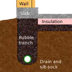 Pour construire une fondation en moellons, une tranchée étroite est creusée sous le seuil du gel. Le fond de la tranchée devrait idéalement être légèrement incliné vers une sortie. Des drains sont ensuite placés au fond de la tranchée sur un lit de galets de rivière protégées par un tissu filtrant. La tranchée est ensuite remplie de pierre tamisée (généralement 1-1/2") ou de gravats recyclés. Une poutre en béton armé peut être coulée à la surface afin de fournir une garde au sol à la structure.