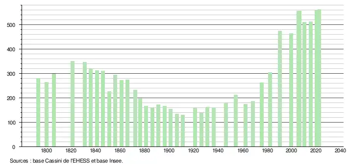 L'évolution du nombre d'habitants est connue à travers les recensements de la population effectués dans la commune depuis 1793. Pour les communes de moins de 10 000 habitants, une enquête de recensement portant sur toute la population est réalisée tous les cinq ans, les populations de référence des années intermédiaires étant quant à elles estimées par interpolation ou extrapolation[19]. Pour la commune, le premier recensement exhaustif entrant dans le cadre du nouveau dispositif a été réalisé en 2005[20].