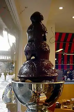 La fontaine à chocolat repose sur la fondue à chocolat, inventée par le suisse Konrad Egli au milieu des années 1960 afin de faire la promotion du chocolat Toblerone[1]