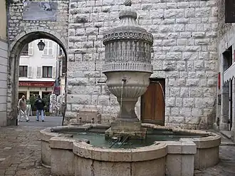 - 1 2 « Fontaine publique », notice no PA00080917, sur la plateforme ouverte du patrimoine, base Mérimée, ministère français de la Culture