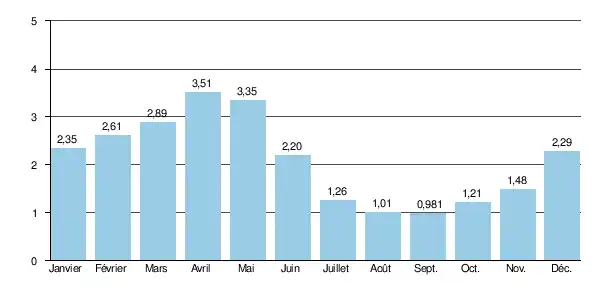 Comme pendant à ces étiages fournis, les crues sont médiocres, l'eau en surplus transitant non par le réseau souterrain, car les pertes se saturent vite, mais par les cours d'eau de surface où se situent ces pertes. Les QIX 2 et QIX 5 valent respectivement 11 et 13 m3/s. Le QIX 10 est de 15 m3/s, le QIX 20 de 16 m3/s, tandis que le QIX 50 se monte à 18 m3/s.
