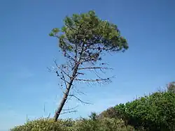 Le pin d'Alep est un conifère d'environ 20 à 30 mètres souvent penché et peu droit, dont la cime est assez écrasée, irrégulière et claire, avec des branches sont assez étalées, et dont la longévité est de 500 ans environ.