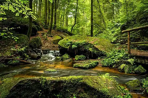 On y trouve un rubanement caractéristique, du bord du canal vers l'extérieur, de sorte que les forêts les plus phréatophytes se situent en bordure ( aulnes , saules ) et les moins dépendantes de l'eau à l'extérieur (frênes, ormes (Ulmus minor, Ulmus glabra et Ulmus laevis) , peupliers). .