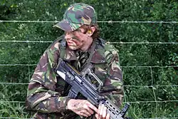 L'arme principale des forces de cadets est le fusil L98A2 Cadet GP[28]. Il s'agit d'une version spécifique aux cadets du L85A2 SA80 des forces armées britanniques qui a été adaptée pour tirer uniquement sur répétition (semi-automatique) et n'a donc pas de levier de changement, le système d'arme est chambré dans la cartouche 5,56 × 45 mm OTAN. Afin de devenir compétent dans ce système d'arme et de réussir le test de compétence aux armes (SAA), les cadets doivent montrer qu'ils peuvent manipuler l'arme en toute sécurité, effectuer des exercices d'arrêt et démonter l'arme sur le terrain pour un nettoyage quotidien[29]. Une fois qu'un cadet a passé le test de maniement des armes, il peut tirer avec des balles à blanc lors d'exercices sur le terrain en utilisant le système de tir à blanc sécurisé (SBFS) et avec des balles réelles sur un champ de tir, ce qui lui permet d'obtenir des badges de qualification de tireur d'élite en fonction de sa précision. Il existe également une version d'entraînement sans tir de la carabine GP, la L103A2 DP (Drill Purpose), qui est généralement utilisée pour enseigner aux cadets les bases de l'arme qu'ils manipulent et pour les exercices de carabine. Le fusil L98A2 Cadet GP peut également être équipé de l'adaptateur de sous-calibre L41A1 de la British Army, qui permet à l'arme de tirer des munitions à percussion annulaire de calibre 22.