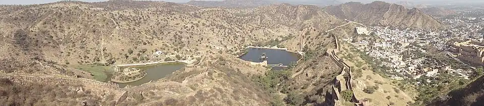 Vue sur le massif de l'Aravalli depuis fort Jaigarh.- Le réservoir d'eau.