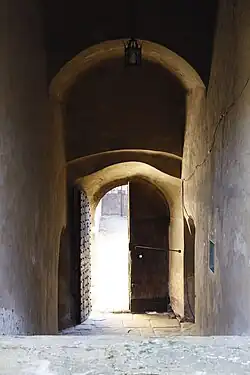 Il y a trois portes à la forteresse, dont une piétonne, une carrossable et une inutilisable. En entrant par la première porte, on se rend immédiatement compte que le niveau intérieur est plus de 2 mètres plus haut que le revêtement extérieur de la route, comme si la partie intérieure de la forteresse avait été remplie de terre.