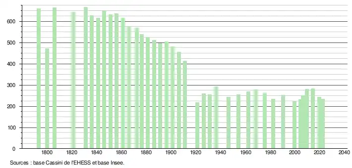 L'évolution du nombre d'habitants est connue à travers les recensements de la population effectués dans la commune depuis 1793. Pour les communes de moins de 10 000 habitants, une enquête de recensement portant sur toute la population est réalisée tous les cinq ans, les populations de référence des années intermédiaires étant quant à elles estimées par interpolation ou extrapolation[31]. Pour la commune, le premier recensement exhaustif entrant dans le cadre du nouveau dispositif a été réalisé en 2004[32].