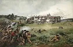 En 1793, lors de la levée en masse, 767 hommes devaient être enrôlés dans le district de Fougères par tirage au sort. En réaction, des attroupements de paysans armés de fusils, de pistolets et de sabres se forment spontanément dès le . Les campagnes se soulèvent et bientôt les troubles dégénèrent en émeutes[44]. La même année, pendant la virée de Galerne, les chouans et les Vendéens s'emparent de la ville le qui est reprise le par les républicains[45]. Pendant huit ans, la ville et sa région passent de main en main, avec au passage de nombreux massacres et pillages. Le chef des chouans des environs de Fougères était le jeune général Aimé du Boisguy.