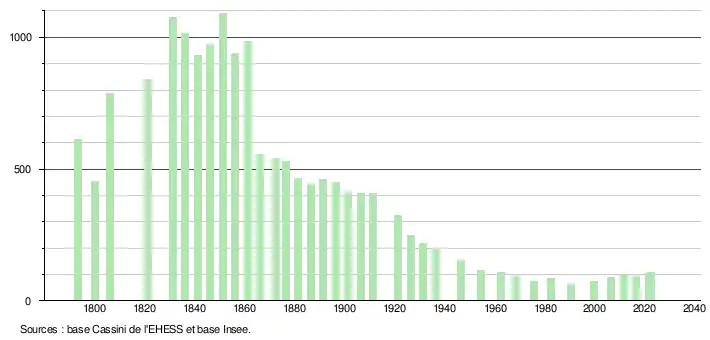 | L'évolution du nombre d'habitants est connue à travers les recensements de la population effectués dans la commune depuis 1793. Pour les communes de moins de 10 000 habitants, une enquête de recensement portant sur toute la population est réalisée tous les cinq ans, les populations de référence des années intermédiaires étant quant à elles estimées par interpolation ou extrapolation[30]. Pour la commune, le premier recensement exhaustif entrant dans le cadre du nouveau dispositif a été réalisé en 2006[31]. En 2022, la commune comptait 109 habitants[Note 4], en évolution de +15,96 % par rapport à 2016 (Haute-Garonne : +8,02 %, France hors Mayotte : +2,11 %). |