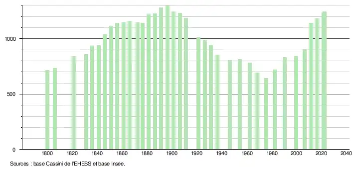 L'évolution du nombre d'habitants est connue à travers les recensements de la population effectués dans la commune depuis 1800. Pour les communes de moins de 10 000 habitants, une enquête de recensement portant sur toute la population est réalisée tous les cinq ans, les populations de référence des années intermédiaires étant quant à elles estimées par interpolation ou extrapolation[17]. Pour la commune, le premier recensement exhaustif entrant dans le cadre du nouveau dispositif a été réalisé en 2006[18].