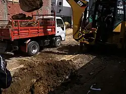 Généralement on utilise la pelle mécanique, qui comporte une flèche articulée à l'extrémité du châssis roulant. Sur cette flèche est articulé un bras qui porte à son extrémité, une pelle mobile. Cette dernière charge elle-même la terre à évacuer sur les camions.