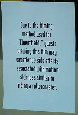 Pour le film Cloverfield en 2008, les cinémas américains AMC Theatres installent des affiches à l'entrée des salles de cinéma pour mettre en garde les spectateurs contre ces effets secondaires éventuels provoqués par le film[18],[19].