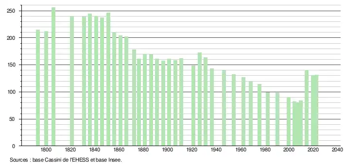 L'évolution du nombre d'habitants est connue à travers les recensements de la population effectués dans la commune depuis 1793. Pour les communes de moins de 10 000 habitants, une enquête de recensement portant sur toute la population est réalisée tous les cinq ans, les populations de référence des années intermédiaires étant quant à elles estimées par interpolation ou extrapolation[32]. Pour la commune, le premier recensement exhaustif entrant dans le cadre du nouveau dispositif a été réalisé en 2004[33].