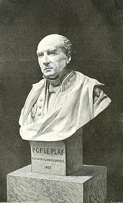 Polytechnicien (Promotion X 1825), ingénieur du corps des mines et sociologue paternaliste français, Le Play se réclamait de la tradition contre-révolutionnaire[2]. Il est l'auteur d'une enquête demeurée célèbre sur « les Ouvriers européens » (1855) ; il est également le fondateur de la Société internationale des études pratiques d'économie sociale et de l'Union de la paix sociale. Sous le Second Empire, Le Play fut conseiller d'État et réalisa de nombreuses études pour le gouvernement de Napoléon III. L'empereur l'appela à siéger au Sénat du Second Empire le .