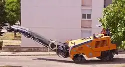 Les petits modèles sont équipés de roues, et les grosses machines les plus courantes de trains à chenilles réglables individuellement en hauteur pour obtenir une position horizontale. Un tambour de fraisage tournant en sens inverse de l'avance de la machine enlève et concasse les revêtements de chaussée ; ce tambour est muni de pointes amovibles en métal dur (carbure de tungstène), similaires aux pointes équipant les scies à rocher[1]. Une bande de déversement frontale, orientable et désaccouplable, assure l'enlèvement. La roue d'appui, permettant le réglage de la profondeur de fraisage, est repliable, à réglage hydraulique. La largeur de travail maximale dépasse 4 m pour les machines les plus puissantes. Le fraisat, récupéré dans la benne d'un camion, peut être réutilisé dans des centrales de recyclage ou d'enrobage. La fraiseuse peut aussi servir pour l'égalisation de chaussées (fraisage fin).