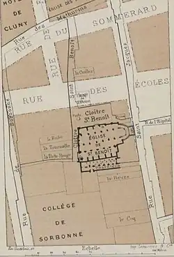 à maître Guillaume de Villon (dont il prend le nom au plus tard en 1456), chapelain de Saint-Benoît-le-Bétourné. Cette église, qui se situe en bordure de la populeuse rue Saint-Jacques près du collège de Sorbonne en plein cœur du quartier universitaire, est desservie par un curé, six chanoines nommés par le chapitre de Notre-Dame et douze chapelains élus par le chapitre de Saint-Benoît[24]. Elle est nommée ainsi parce que son chœur, orienté non pas à l'est mais à l'ouest, est « mal tourné ».