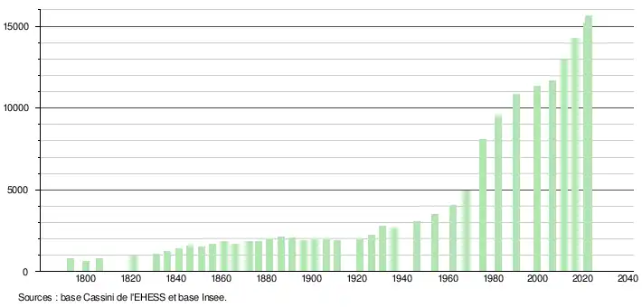 - ↑ Par convention dans Wikipédia, le principe a été retenu de n’afficher dans le tableau des recensements et le graphique, pour les populations de référence postérieures à 1999, que les populations correspondant à une enquête exhaustive de recensement pour les communes de moins de 10 000 habitants, et que les populations des années 2006, 2011, 2016, etc. pour les communes de plus de 10 000 habitants, ainsi que la dernière population de référence publiée par l’Insee pour l'ensemble des communes.
