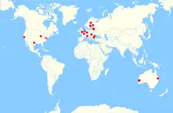 Localisations des 24 serveurs du réseau freenode en octobre 2010.