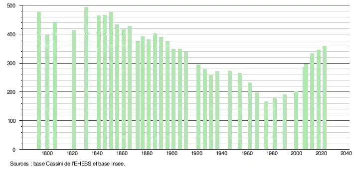 L'évolution du nombre d'habitants est connue à travers les recensements de la population effectués dans la commune depuis 1793. Pour les communes de moins de 10 000 habitants, une enquête de recensement portant sur toute la population est réalisée tous les cinq ans, les populations de référence des années intermédiaires étant quant à elles estimées par interpolation ou extrapolation[24]. Pour la commune, le premier recensement exhaustif entrant dans le cadre du nouveau dispositif a été réalisé en 2007[25].