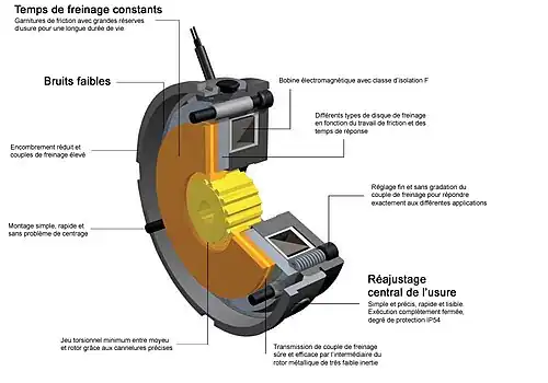 • le frein est composé d’une bobine électromagnétique qui, lorsqu’elle est excitée sous un courant électrique, engendre un champ magnétique ;
