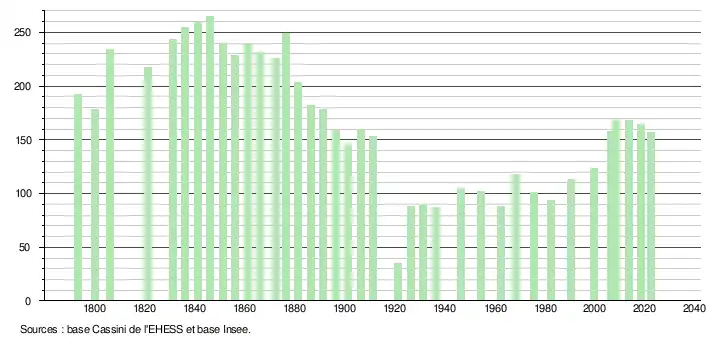 L'évolution du nombre d'habitants est connue à travers les recensements de la population effectués dans la commune depuis 1793. Pour les communes de moins de 10 000 habitants, une enquête de recensement portant sur toute la population est réalisée tous les cinq ans, les populations de référence des années intermédiaires étant quant à elles estimées par interpolation ou extrapolation[23]. Pour la commune, le premier recensement exhaustif entrant dans le cadre du nouveau dispositif a été réalisé en 2008[24].