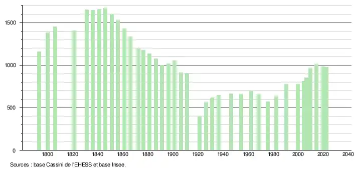 L'évolution du nombre d'habitants est connue à travers les recensements de la population effectués dans la commune depuis 1793. Pour les communes de moins de 10 000 habitants, une enquête de recensement portant sur toute la population est réalisée tous les cinq ans, les populations de référence des années intermédiaires étant quant à elles estimées par interpolation ou extrapolation[40]. Pour la commune, le premier recensement exhaustif entrant dans le cadre du nouveau dispositif a été réalisé en 2004[41].