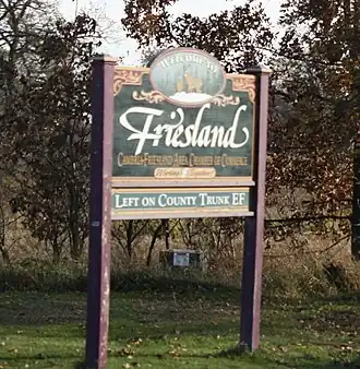 - (en) Cet article est partiellement ou en totalité issu de l’article de Wikipédia en anglais intitulé « Friesland, Wisconsin » (voir la liste des auteurs).