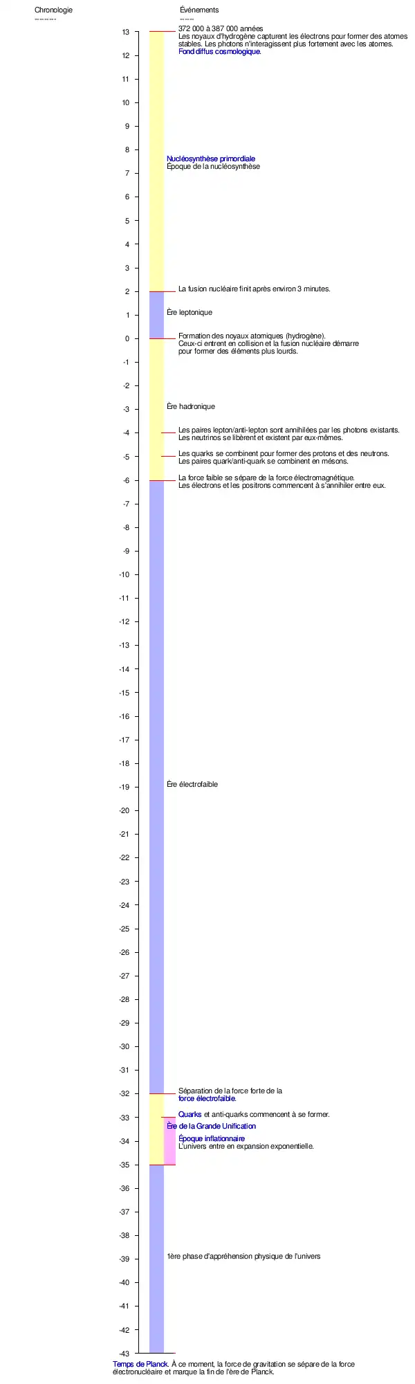 Cette chronologie du Big Bang montre les différentes phases de l'évolution de l'univers telles que prévues par la théorie du Big Bang, depuis l'ère de Planck jusqu'à la fin de l'époque de la nucléosynthèse (et du commencement de l'époque des galaxies).