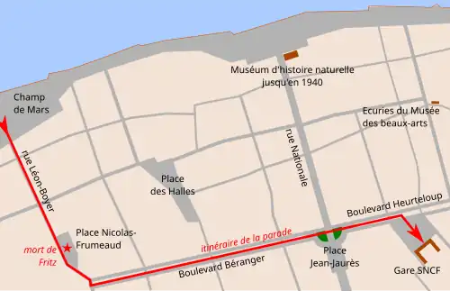 Dans la soirée du , après les représentations, le cirque organise une parade dans la ville de Tours depuis le Champ de Mars en passant par la rue Léon-Boyer, le boulevard Béranger pour enfin terminer à la gare de Tours où les animaux sont rembarqués dans les wagons. Pour l'occasion, de nombreux Tourangeaux et habitants des communes voisines sont venus admirer ce défilé. Par ailleurs les parades constituent quasiment les seules sorties occasionnelles des bêtes. Lorsque le cortège arrive à la place Nicolas-Frumeaud, Fritz devient incontrôlable pour une raison inconnue. Il aurait, d'après certaines sources, et particulièrement un extrait de presse dans Le Mémorial du Poitou, été brûlé sur la trompe avec un cigare ou aurait avalé une cigarette, ce qui pourrait expliquer l'origine de sa folie[6]. Cependant, il semblerait que cette rumeur ne soit que légende puisqu'aucune source tourangelle d'époque ne la mentionne ; l'hypothèse la plus probable est que l'animal est alors en période de musth, caractérisée entre autres par une forte agressivité. L'éléphant, très imposant, ne peut être maîtrisé et le directeur du cirque prend la décision de l'abattre[3]. Les employés du cirque l'encerclent avec d'autres éléphants pour tenter de le contrôler mais aussi de le faire tomber. Une fois l'éléphant à terre, des chaînes et des cordes reliées à des palans sont enroulées autour de son cou dans le but de l'étrangler. Fritz meurt environ trois heures après[2],[7].