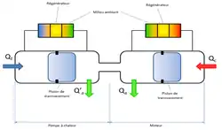 Le système bielle-manivelle reliant les deux pistons est également entraîné par un moteur électrique dont le rôle est de compenser les pertes mécaniques. - Machine de Vuilleumier avec piston de puissance