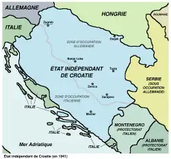 Après l'invasion, Hitler préconise la disparition pure et simple de l'État yougoslave, qui n'est à ses yeux qu'une création artificielle issue du traité de Versailles[44]. Dans son optique, les Serbes — qu'il hait tout particulièrement[45] car il les juge responsables de la Première Guerre mondiale[34] — doivent être châtiés, les Croates ralliés à l'Axe et les Slovènes germanisés ou dispersés. L'Allemagne, qui a déjà acquis avant-guerre une position économique dominante en Yougoslavie, se taille la part du lion en s'emparant des lignes de communication et des principaux gisements de minerais[N 3], tandis qu'elle se charge de satisfaire les revendications territoriales de ses alliés. Les Italiens, désireux d'accroître leur « espace vital », doivent cependant en rabattre et accepter le partage tel qu'il a été décidé par les Allemands. Outre les annexions et occupations des diverses parties du pays, deux États sont autorisés à exister sur le territoire de la Yougoslavie démembrée : la Croatie, dont le gouvernement est confié aux Oustachis et qui annexe l'intégralité de la Bosnie-Herzégovine, et la Serbie — ramenée, peu ou prou, à ses frontières d'avant les guerres balkaniques de 1912-1913 — où est formé un gouvernement collaborateur[44].
