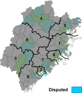 Les îles côtières (les îles Matsu, Wuqiu, Kinmen et Lieyu) formant l'actuelle province taïwanaise du Fujian en font aussi historiquement partie, mais sont restées sous le contrôle du parti nationaliste de la république de Chine dont le gouvernement s'installa sur l'île de Taïwan situé en face du Fujian de l'autre côté du détroit de Taïwan, à la fin de la guerre civile chinoise et de la déclaration de la république populaire de Chine.