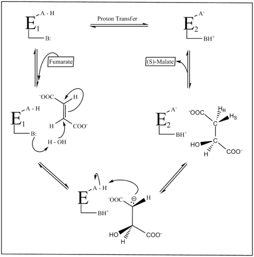 La figure ci-dessous illustre le mécanisme réactionnel de la fumarase. Deux groupes acide-base catalysent le transfert de protons, et l'état d'ionisation de ces groupes est en partie défini par les deux formes E1 et E2 de cette enzyme. À l'état E1, le groupe se présente sous une forme neutre A–H/B, tandis qu'à l'état E2 il se présente sous une forme zwittérionique A−/BH+. C'est l'état E1 qui se lie au fumarate et favorise sa conversion en malate, tandis que l'état E2 se lie au malate et favorise sa conversion en fumarate. Les deux formes doivent subir une isomérisation lors de chaque cycle catalytique.