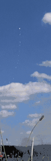 Sur l'animation ci-contre, on note qu'en fin de propulsion une certaine quantité d'eau est éjectée de la fusée avec une vitesse relative vers le bas inférieure à la vitesse instantanée absolue de la fusée vers le haut : c'est ce qui fait que cette eau continue à monter après son éjection. (voir le fichier original qui comporte d'autres informations « par effleurement »)