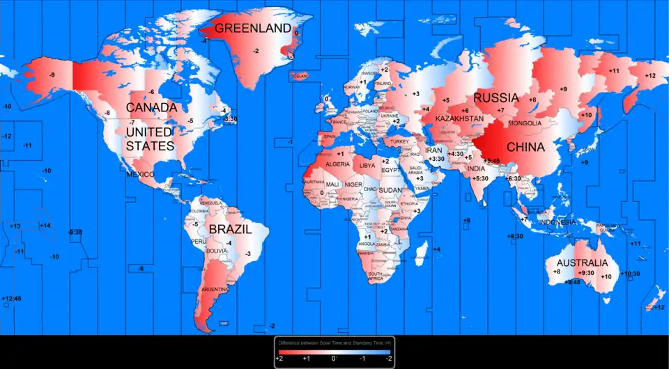 - Certains pays de taille étendue (Australie, Brésil, Canada, RD Congo, États-Unis, Indonésie, Russie, etc.) sont divisés arbitrairement en plusieurs fuseaux horaires de tailles variables : leurs limites peuvent ainsi se trouver franchement décalées par rapport à celles qui rapprocheraient l'heure légale de l'heure solaire. C'est également le cas de certaines dépendances éloignées, comme les DROM-COM français, les Açores portugaises, etc.