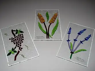 Poser dessus des morceaux de verre : en plaque, concassés, fritte, fils, de différentes couleurs en fonction du motif souhaité. Les verres doivent être testés compatibles entre eux.