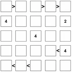 La résolution d'un puzzle suppose le recours à plusieurs types de techniques logiques[1]. Les nombres présents dans chaque ligne et colonne, de même que les inégalités, restreignent les nombres possibles dans les autres cases de la même ligne et colonne.