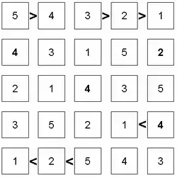 Comme un Sudoku, un Futoshiki résolu est un cas particulier de carré latin.