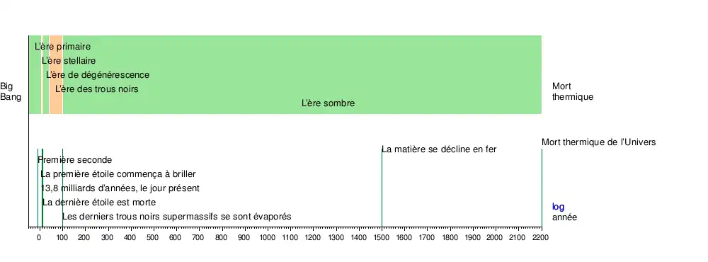 - Graphique chronologique depuis le Big Bang jusqu'à la mort thermique de l'Univers. Cette chronologie utilise la double échelle logarithmique en comparaison avec le graphique chronologique de cet article.