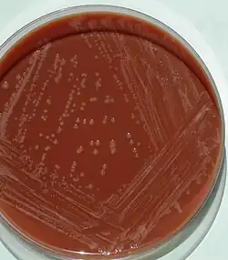 C'est une gélose rouge vif contenant des globules rouges (souvent du sang de mouton). Peu sélective, elle permet cependant d'apprécier l'hémolyse qu'effectuent certaines bactéries. Les bactéries capables de détruire complètement les globules rouges (ce qu'on appelle une hémolyse bêta) formeront des colonies entourées d'une zone claire facilement visible sur la gélose rouge; si l'hémolyse est incomplète (hémolyse alpha), la zone d'hémolyse sera moins claire et verdâtre. Une hémolyse complète est visible entre autres dans le cas du Streptocoque du groupe A.