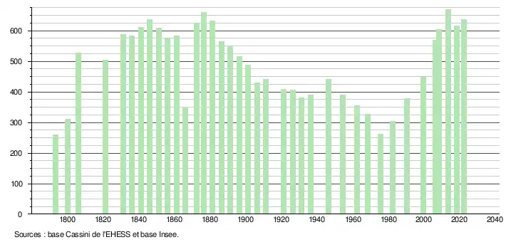 L'évolution du nombre d'habitants est connue à travers les recensements de la population effectués dans la commune depuis 1793. Pour les communes de moins de 10 000 habitants, une enquête de recensement portant sur toute la population est réalisée tous les cinq ans, les populations de référence des années intermédiaires étant quant à elles estimées par interpolation ou extrapolation[30]. Pour la commune, le premier recensement exhaustif entrant dans le cadre du nouveau dispositif a été réalisé en 2008[31].